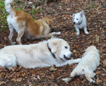 Im Wald angekommen purzelten die Welpen voller Begeisterung durch das Laub, während Ginger und ich erstmal die Nase in den Wind hielten – und ich sage euch, dass roch da gut!!!!!!