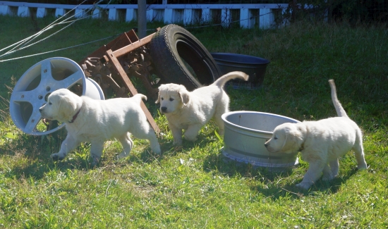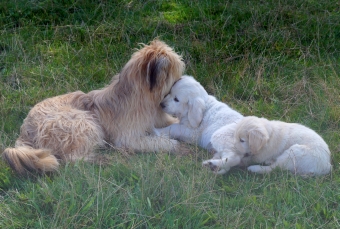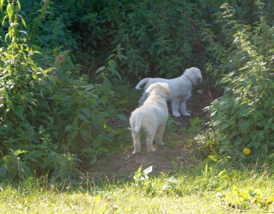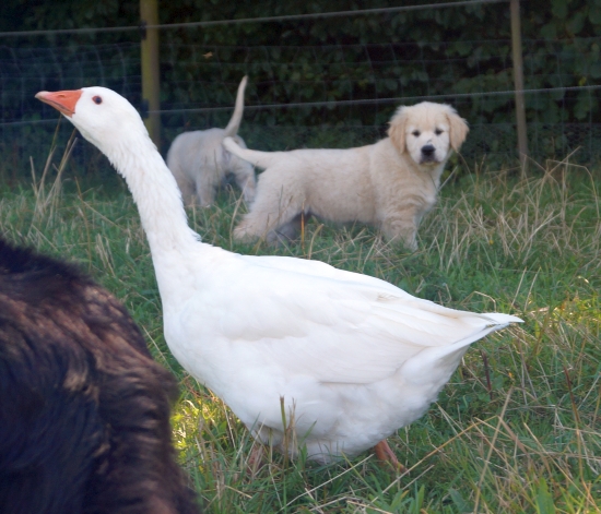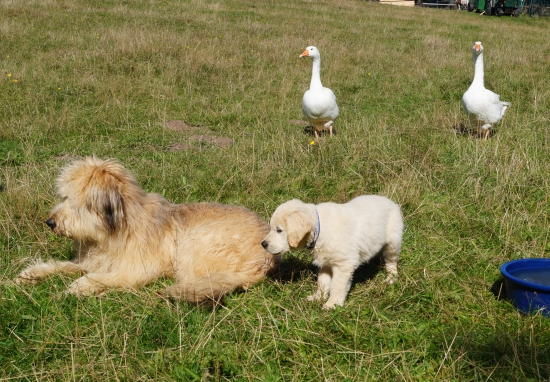 Nach absolviertem Training zogen sich alle in den Schatten zu einer Schüssel Wasser zurück. Nach kurzer Zeit gesellten sich Schnee und Flocke, die beiden Gänse, hinzu. Wahrscheinlich wollten sie auch einen Schluck aus der Schüssel abstauben, aber die wuseligen Welpen waren ihnen doch ein bißchen suspekt.
