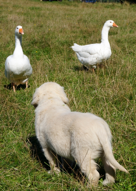 Auch die Carlitinchen machten große Augen – bisher kannten sie Gänse nur mit einem großen Zaun dazwischen. Aber da die weißen Kollegen keine Anstalten machten Feuer zu spucken oder plötzlich mit spitzen Zähnen anzugreifen, war die Scheu bald überwunden und die Chefin musste doch ein paar klare Worte finden, dass man Gänsen nicht an den Schwanzfedern zupfen darf.