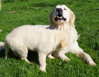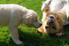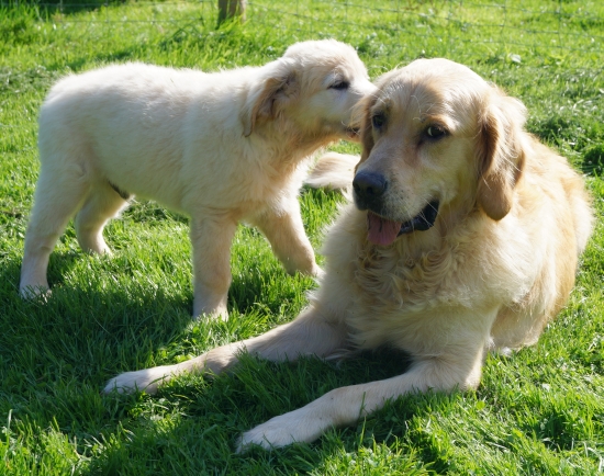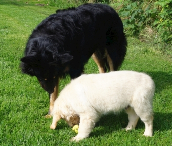 Manchmal merkt man, dass Ginger eigentlich gerne schon ein bißchen wilder spielen würde, aber da unser Kleiner dann sofort hoffnungslos aus den Latschen kippt und nur noch mit den Augen rollen kann, während die Beinchen ihm vor lauter Aufregung den Dienst versagen, fährt sie sich sofort runter und lässt den Murkelmann auf ihrer Kehle rumkauen.