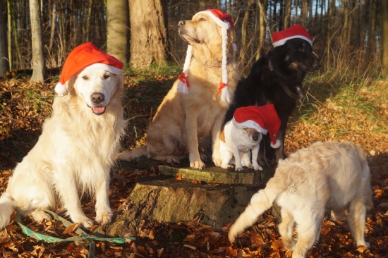 Die Chefin überredete den Chef das seltene Sonnenwetter zu nutzen, stopfte alle Hunde samt Murkel ins Auto und fuhr mit uns in den Wald um das diesjährige Weihnachtsfoto zu schießen. Ich war übrigens ganz ihrer Meinung: Wenn schon ein Weihnachtsfoto, dann bitte in spannender Umgebung, im Garten oder auf der Couch wird es langsam langweilig ...