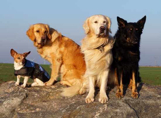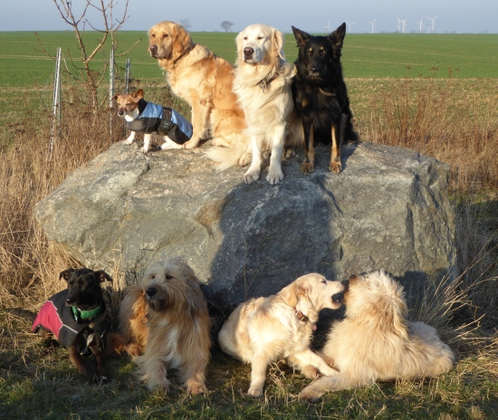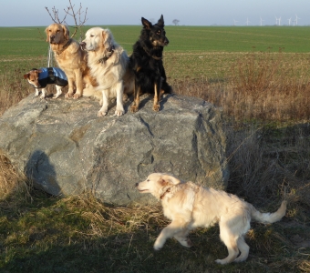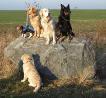 Aber an „unserem“ Stein durfte Flippy dann doch wieder frei umher springen und Chaos verbreiten: Wir Großen waren natürlich schnell in Position gesprungen und lächelten wie immer mehr oder minder aufmerksam in die Kamera. Murkel konnte überhaupt nicht verstehen, warum er, Spitzensportler der er (in seinen Augen) ist – nicht zu uns auf den Stein hoch kam.