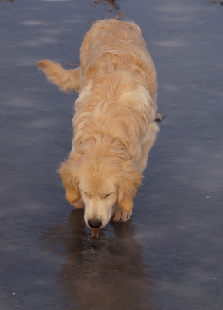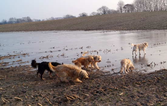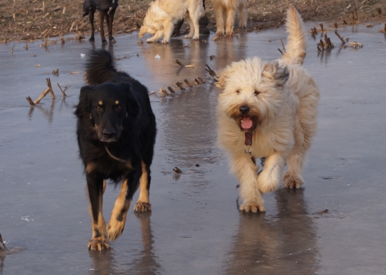 Nach und nach traute sich das ganze Rudel auf die glatte Fläche, aber irgendwie wirkten alle ein bißchen schmaler als sonst – wenn hund das Fell ganz eng anlegt, kann er die Spannung auf allen vier Füßen besser halten.