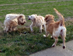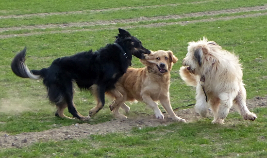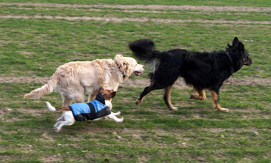 Nach vollbrachter Tat konnten alle sogar sehr manierlich an der Leine gehen. Ein Rudel an der Leine zu führen ist rein technisch eine Herausforderung, vor allem wenn Chaoten-Murkel noch von gar nichts eine Ahnung hat. Aber die Chefin findet, er macht seine Sache ganz gut, wie seine Frau Mama zieht er eigentlich überhaupt nie an der Leine.