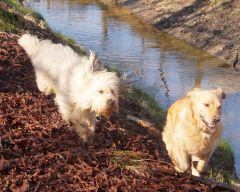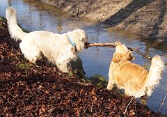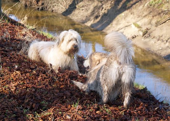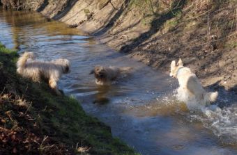 Nachdem wir drei Mini-Rudelgruppen genug brav gewesen waren, kamen wir glücklicherweise an einen wunderschönen Wassergraben, wo eine lange Spielpause eingelegt wurde. Die Gruppen lösten sich in Wohlgefallen auf und wir tobten bunt gemischt durrch Wald und Wasser..