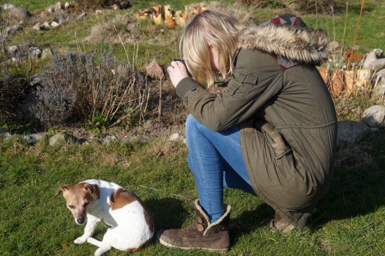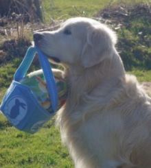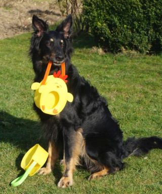 Mit Hilfe von Freundin Katrin und Tochter Mette ist sogar ein kleiner Osterfilm entstanden. Die Menschen finden es einfach zu niedlich, wenn der kleine Murkel Gegenstände durch die Gegend trägt und an Ostern bietet sich ein Apportierfilm einfach an.