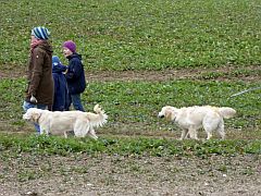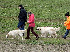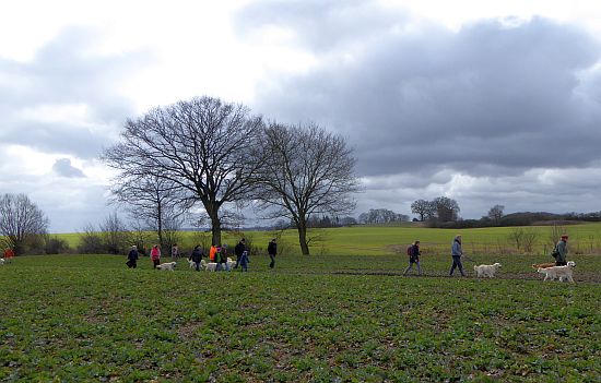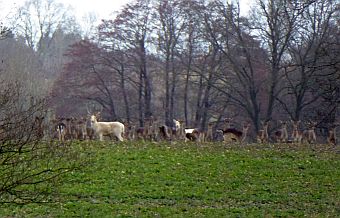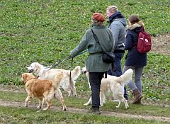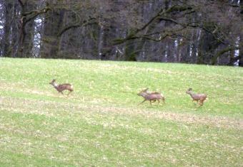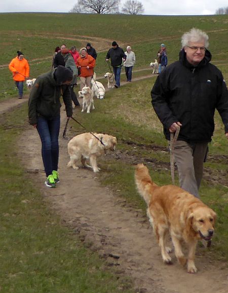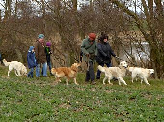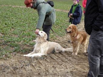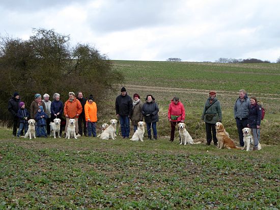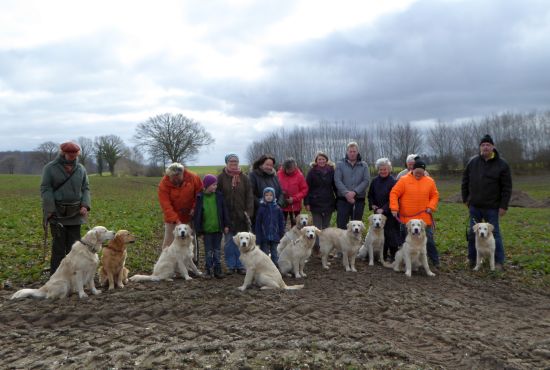 Als erstes präsentierte sich das große Dammwildrudel von Güsdorf, inklusive weißem Hirsch. Angesichts unserer dominierenden Golden Retriever Präsenz verzogen die Kollegen sich aber bald in ein Wäldchen und so gab es leider kein Bild mit Hirschen u n d Hunden.