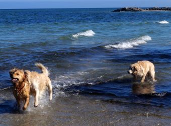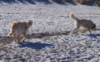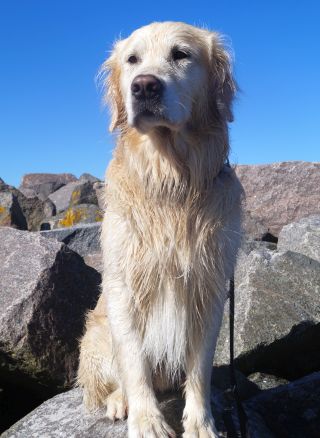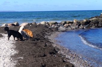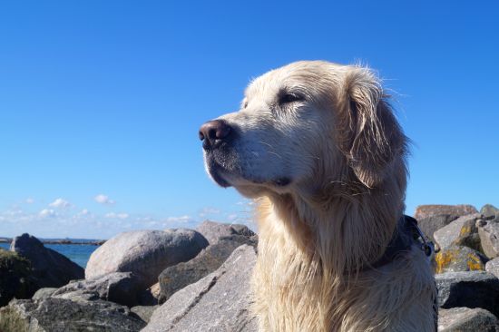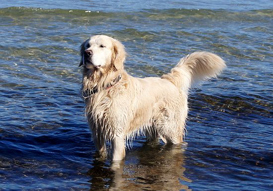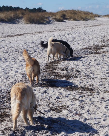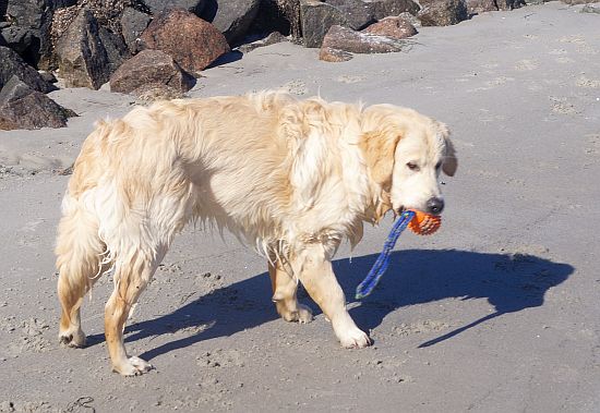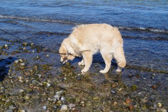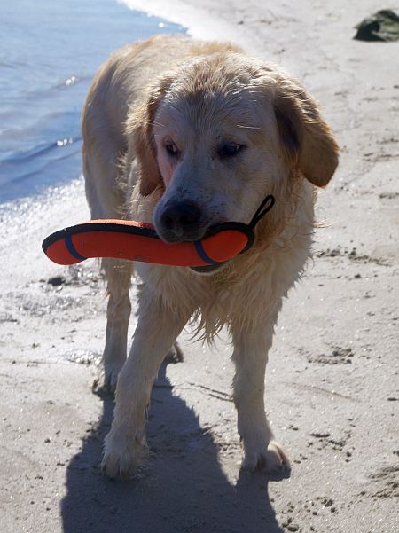 Das Wetter war strahlend schön, das Wasser ruhig und der Strand leer – ein paradiesischer Moment für jeden Retriever! Alles ließ sich gut an: Murkel schnüffelte sich am Spülsaum entlang und ließ sich auch von nassen Pfoten nicht beeindrucken.