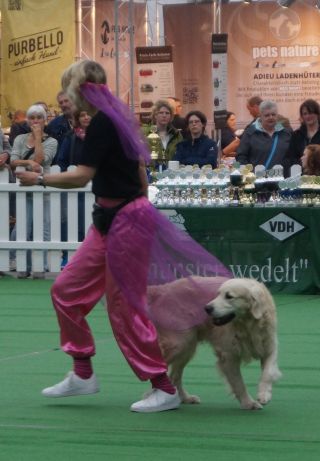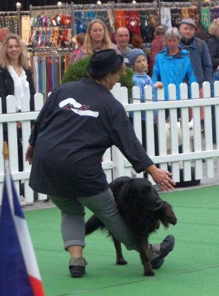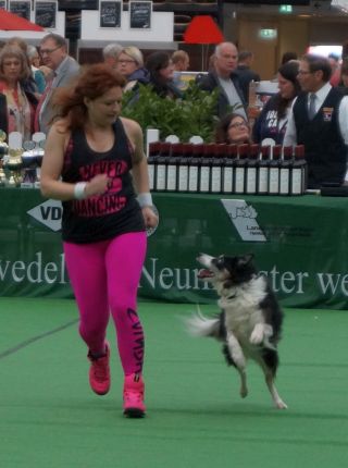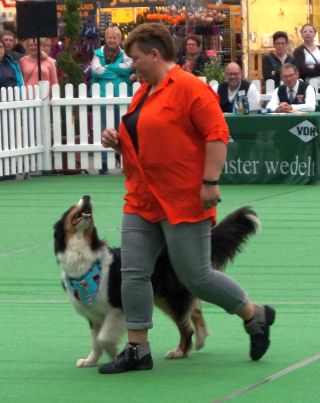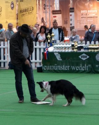 Es lief alles ganz prima! Auch Mex, der dieses Jahr das erste Mal dabei war, guckte zwar hin und wieder ob seine Junior-Chefin noch am Rand stand, war aber ansonsten freudig bei der Sache. Das ist nicht selbstverständlich, denn gerade für einen Hütehund, der ja gerne alles unter Kontrolle hat, sind die vielen Außenreize auf einer Hundeausstellung sehr stressig. Doch Mex konzentrierte sich auf seine „Mama“ und schaffte auch die schwierigeren Tricks mit Bravour.