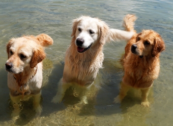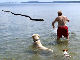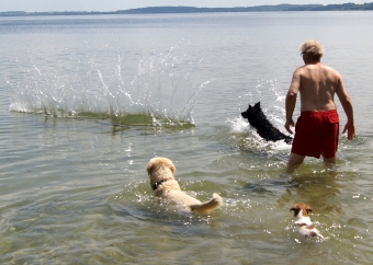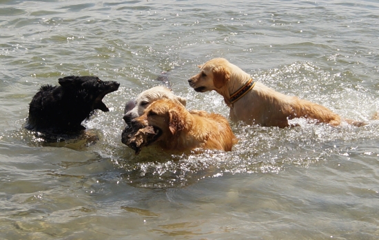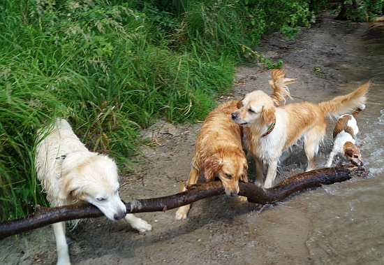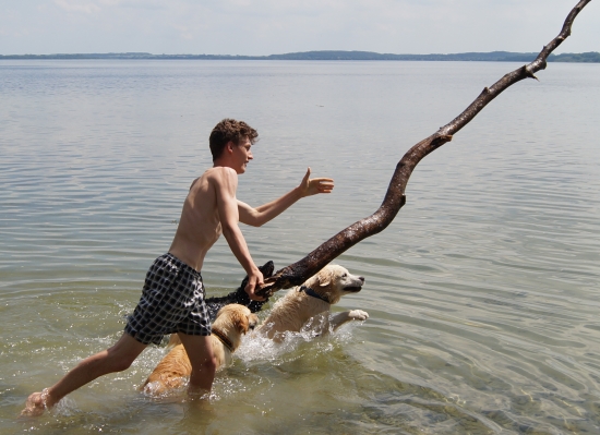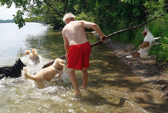 Insbesondere der Terrier fand diesen Teil der Party extrem lustig und schwamm voller Eifer sogar mit hinaus, als der Chef den Stamm wieder und wieder ins Wasser wuchtete.