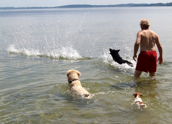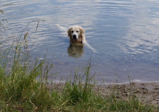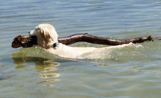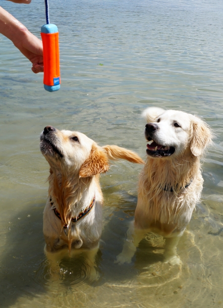 Jack und ich sind natürlich mit dem Chef zur Feier des Tages ganz weit raus geschwommen. Das Wasser war klar und wellenlos, so dass der Chef unsere Dummies richtig weit werfen konnte. Training am Geburtstag – so soll es sein!