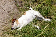 Als der Chef zum nächsten Wurf ausholen wollte, hing unbemerkt noch der Jack Russell am hinteren Ende des Stammes und wurde kurzfristig in luftige Höhe gehoben, bevor er losließ und ins Wasser purzelte.