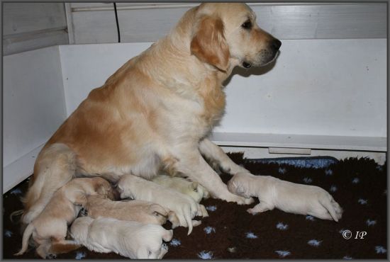 Über und untereinander wird da gedrückt und geschoben, aber bei 7 Welpen kommt sicherlich keiner zu kurz. Manchmal setzt Summer sich sogar schon auf, damit sich die Welpen recken und strecken, um die Zitzen zu erreichen.