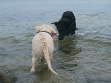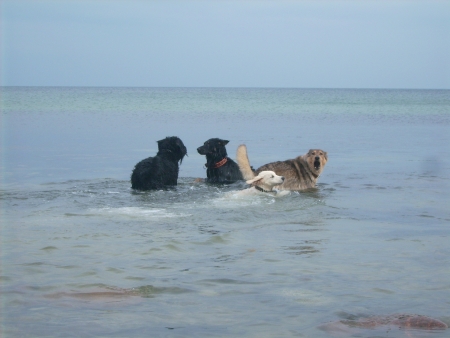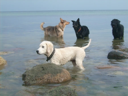 Die großen Hunde standen die ganze Zeit im Wasser rum, vielleicht haben sie das Ganze mit einer großen Badewanne verwechselt – oder sie waren sauer auf die Chefin, weil die den Ball vergessen hatte.