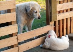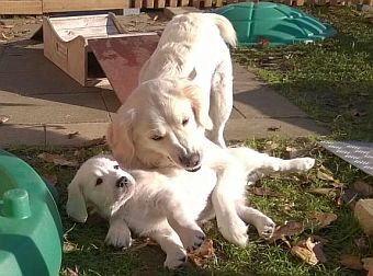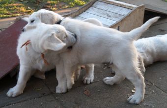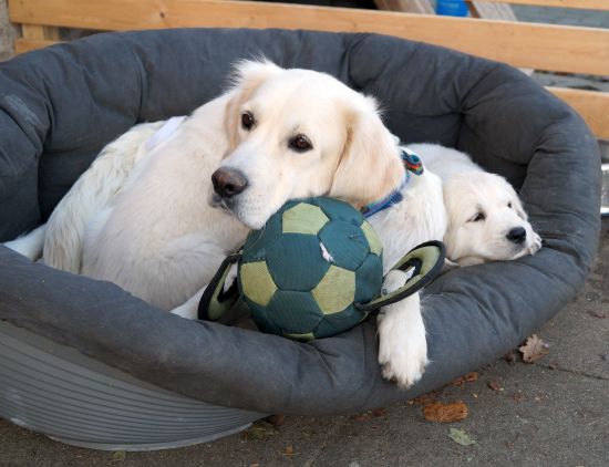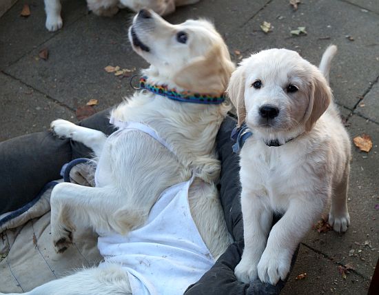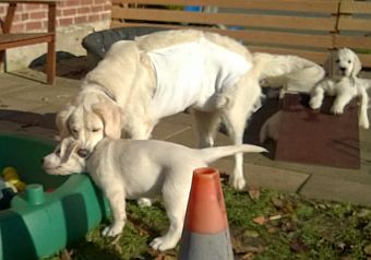 Den weißen Riesen passte das natürlich nicht wirklich, und immer wieder versuchte einer der kleinen Schwerenöter sich durch das Leibchen an die mütterlichen Zitzen zu wurschteln. Aber Nelly ist zu einer echten Hundemutter heran gereift und weiß jetzt, wie man sich kleiner niedlicher Terroristen erwehrt: