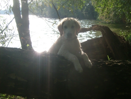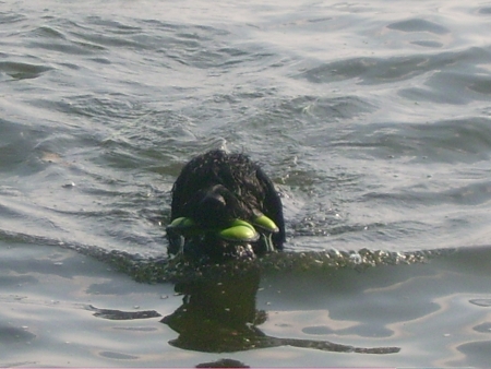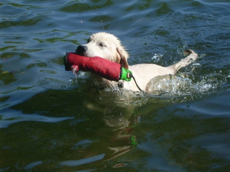 Wie ein wahrer Retriever habe ich den Dummy ans Ufer getragen und mich erst geschüttelt, wenn die Chefin ihn mir abgenommen hatte. Naja, eigentlich wollte ich das Teil natürlich behalten und in Ruhe richtig durchkauen, aber immer wenn ich ans Ufer geschwommen kam, stand die Chefin schon bereit und hat ihn mir unter viel Gejubel und Lob abgenommen – ach, und wenn sie so begeistert ist, kann ich nicht widerstehen.