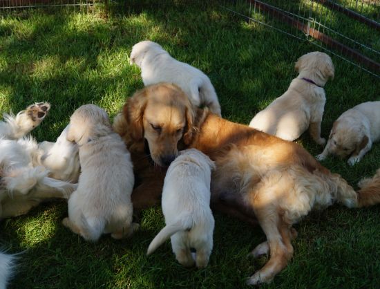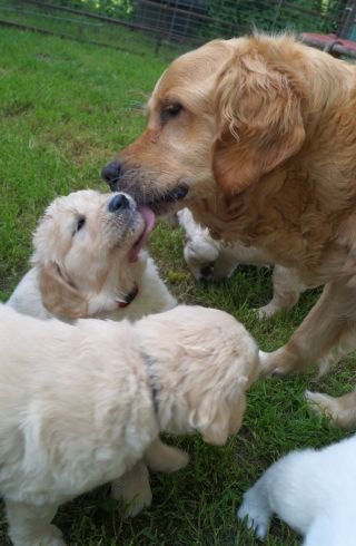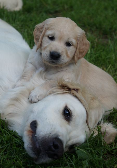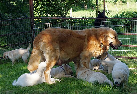 Wie bei den Bambini verbringt Ginger sehr gerne Zeit allein mit den Welpen und wartet ab, bis die Chefin sich ins Büro verzieht, bevor sie sich ausgiebigst ihren Sprösslingen widmet. Mit unendlicher Geduld lässt sie sich in Pfoten und Rute beißen, und nur wenn der Nachwuchs gar zu sehr an die Zitzen drängt, hört man ein dunkles Grollen.