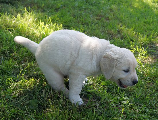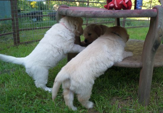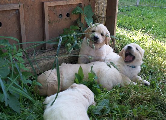 In der vergangenen Woche haben die kleinen C-linge einen großen Sprung gemacht: bei schönstem Wetter haben sie das große Gartengehege bezogen. Das Gras hat sie geradezu in Ekstase versetzt. Als erstes haben sie als echte Retriever reingebissen und versucht alles aufzufressen, und als das nicht gelang sind sie wie toll hindurch getobt.