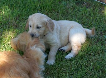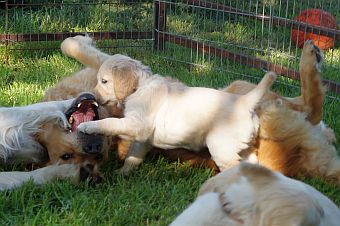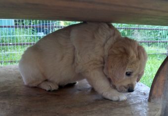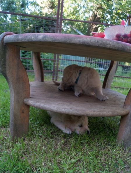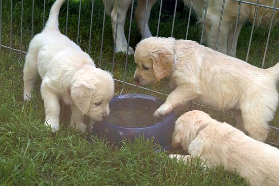 Die Welpen finden alles spannend, sie fangen an kleine Löcher zu buddeln und Herr Türkis, der kleine Cello, wie ihn seine musikalische Familie nennen wird, hat sogleich entdeckt, dass Retriever Wasser nicht nur zum Trinken verwenden und hat heftig im Wassernapf gescharrt – er wird voll der Sohn seines Vaters!