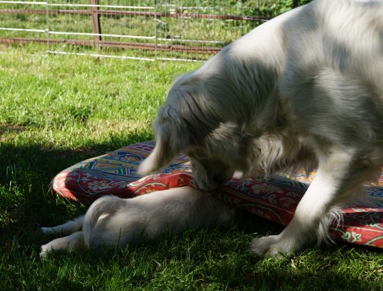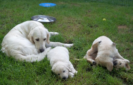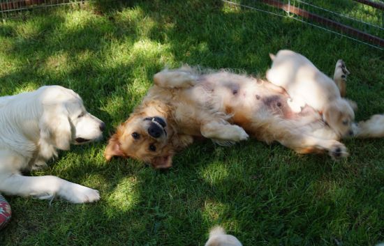Am allerschönsten im Garten ist aber, dass Mama Ginger wieder voll ins Erziehungsboot gestiegen ist und sehr viel Zeit mit den Kleinen verbringt. Seitdem die Welpen zweimal am Tag Fleisch bekommen, hat ihr Milchbedürfnis endlich etwas nachgelassen und sie sehen in Muttern nicht mehr ausschließlich eine Milchbuddel, sondern zunehmend eine liebevolle Spielpartnerin