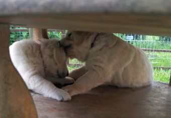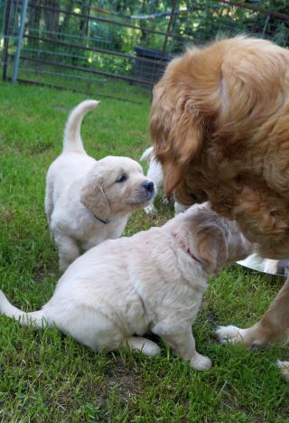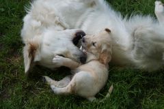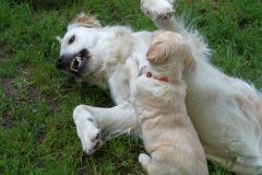 Simba ist natürlich völlig in ihrem Element, sie spielt mit den Welpen, bringt ihnen aber parallel auch schon bei, dass sie die Chefin ist, die die Oberhoheit über alles Spielzeug hat.