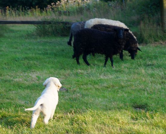 Ginger führte Leo zum Beispiel an den Schafen vorbei. Natürlich fand er sie höchst interessant, aber als Ginger weiter schlenderte, flitzte er ihr lieber hinterher als mit den großen Kumpeln allein zu sein.