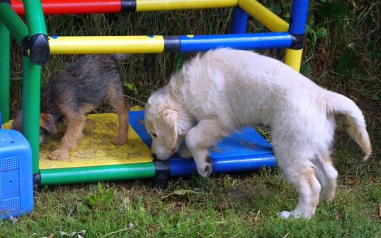 Samstags war dann die erste Welpenstunde und zur großen Überraschung der Buben trafen sie ihre Schwester Mailie wieder, die sich schon mit größter Selbstverständlichkeit unter den anderen Welpen tummelte.