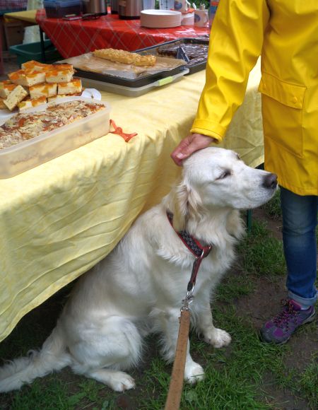 Als die große Party dann mittags losging, mussten wir erwachsenen Hunde im Haus bleiben und nur Simba und Cello durften beim Empfang der vielen, vielen Hunde dabei sein. War nicht so schlimm, denn, wie Simba schnell herausfand, war das große Buffet für die Menschen und gar nicht für die Hunde gedacht. Und alle mussten sehr brav und höflich an der Leine sein. Da habe ich lieber noch ein Nickerchen gemacht.