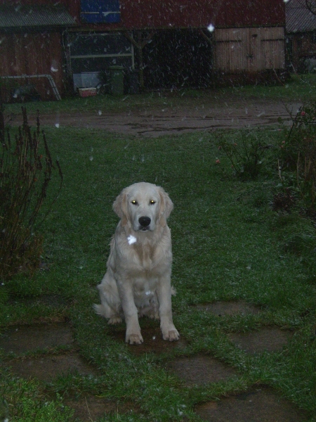 Aber heute kam es in weiß und feucht und kalt von allen Seiten und setzte sich frostig auf meine dicke schwarze Nase. Habe versucht alles wegzuschnappen, aber im Gegensatz zu den Seifenblasen war ich bei diesen Teilen nicht sehr erfolgreich – es waren zu viele.