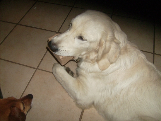 6 Monate und 27,2 Kilogramm, 42 strahlende Zähne und eine Rute, die das pinselartige Aussehen langsam verliert. Meine Creme-Farbe sieht man zur Zeit selten, bei dem Matschwetter passe ich mich dezent der Umgebung an.