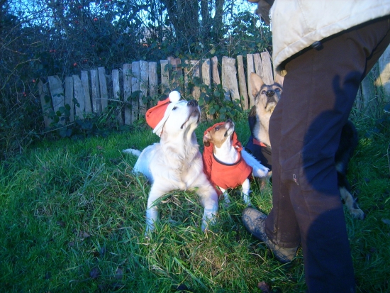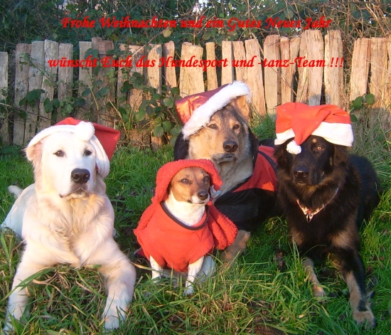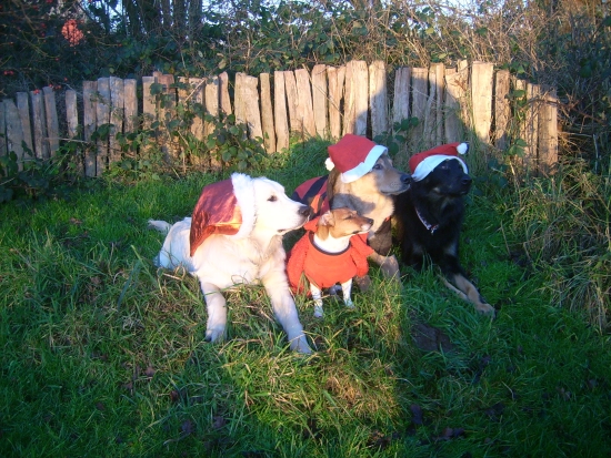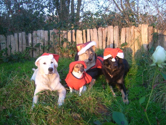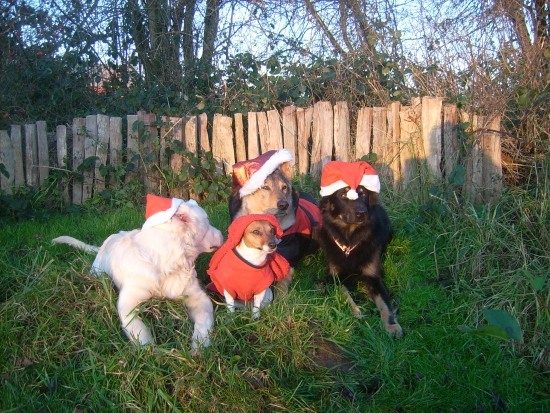 Und dann begann ein langwieriges Geduldspiel, wer schafft es vier Hunden, vier verschiedene Mützen zur gleichen Zeit auf den Kopf zu setzen und dabei immer liebreich und weihnachtlich freundlich „O, Du Fröhliche“ zu summen?