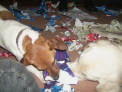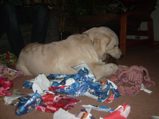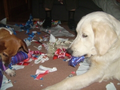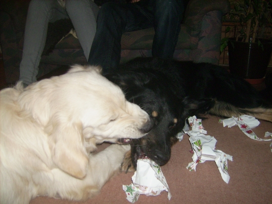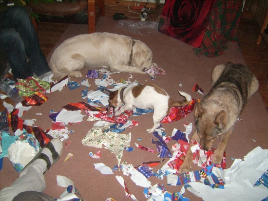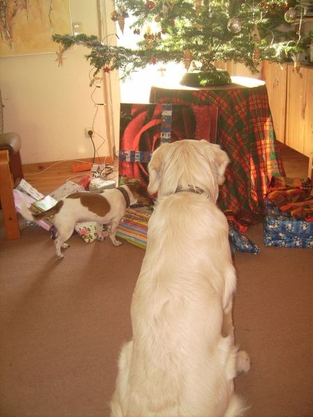 Es stellte sich heraus, dass die Päckchen unter dem Baum Auspackpakte für Menschen waren. Doch da die Menschen sich mit dem Auspacken schwer taten und sie ja glücklicherweise mehrere Hunde mit einschlägiger Auspackerfahrung zur Hand, äh Pfote hatten, wurde die gesamte Bescherung eine Riesen-Gaudi.