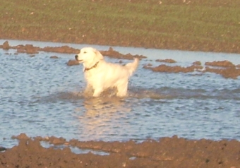 Bevor ich der Sache näher auf den Grund gehen konnte, sind wir erstmal Spazieren gegangen – das war das erste Highlight des Tages. Dank des vielen Regens der letzten Tage, sind viele Felder geflutet und ehe noch die Chefin tief Luft geholt hatte, raste ich quer durch einen neu entstandenen See. Ich tauchte und spritzte, dass es die reine Freude war – die Chefs nahmen`s mit Resignation.
