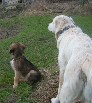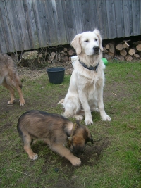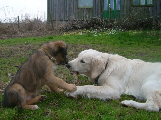 Danach war das Eis ziemlich gebrochen, und als der Knirps noch an meinem Ast mitnagen durfte, war sein Argwohn vor übergroßen cremefarbenen Retrievern erloschen. Ich bin ein perfekter großer Bruder!