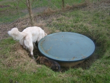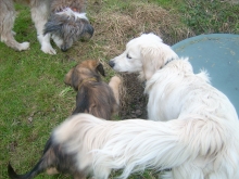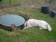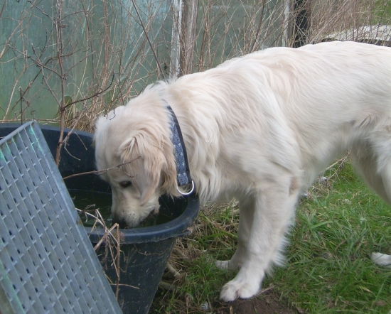 Nachdem ich eine Weile groß und wichtig herum gestanden hatte, meine Spielaufforderungen nicht so richtig rüber kamen, bin ich erstmal eine Runde Eisfischen und Bläschen blubbern gegangen. Es gibt nichts Schöneres als die Nase in einen Wassernapf oder -bottich zu tauchen und ordentlich zu blubbern. In der Wohnung meckert die Chefin dann immer ganz fürchterlich, weil danach die ganze Küche schwimmt, aber draußen darf ich nach Herzenslust planschen!