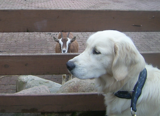 Jack sollte dann die Pfoten auf die Brüstung setzen, um auch was von den angeblichen Carlos-Rindern zu sehen – und was macht der Hirsch? Statt „Hoch“ versteht er „Hopp“ und versucht über die Brüstung ins Gehege zu springen. Die Chefin riss ihn gerade noch zurück, wobei sie beide mit den Köpfen zusammen knallten, was die Stimmung kurzfristig extrem verschlechterte.