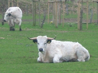 Die Chefin hievte mich auf eine Bank, damit ich auch was sehen konnte. Meine Güte Kühe! „Ist doch nix besonderes“, dachte ich. Da sagt die Chefin: „Das sind Englische Parkrinder, die sehen genauso aus wie Du, Carlos, weiß mit großer schwarzer Nase!“