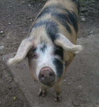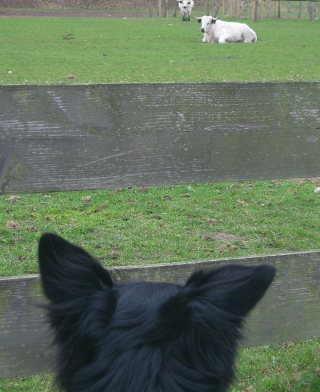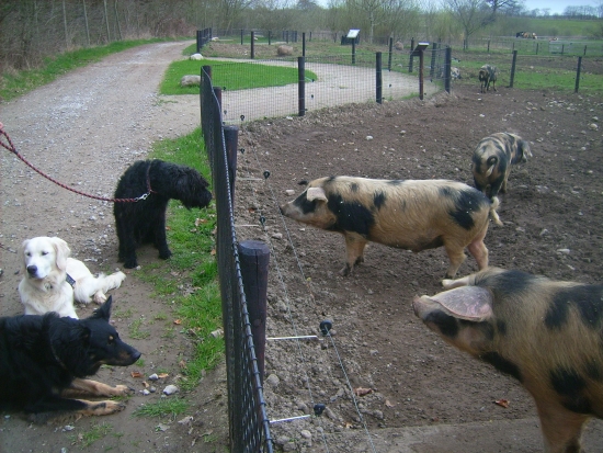 Eins – wahrscheinlich ein „Allein-Schwein“ - war ziemlich zickig drauf. Aus Frust, weil niemand mit ihm rüsseln und kuscheln und Liebe machen wollte, machte es sich an Yasha heran. O.k., mit viel Phantasie geht er von hinten als „Schwarzes Mangalitza Wollschwein“ durch und so dachte auch das Schwein. Es kam ganz nah an den Zaun heran und wollte Yasha gerade anrüsseln, als dieser ihm seinen doch markanten Hundekopf zuwendete. Das Schwein stieß einen Entsetzensschrei aus und sprang einen Meter zurück – wir alle übrigens auch, man weiß ja nicht, wie gefährlich so ein liebesenttäuschtes Schwein auf einmal wird!
