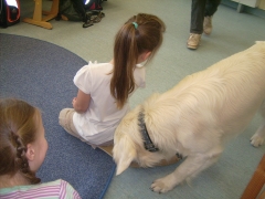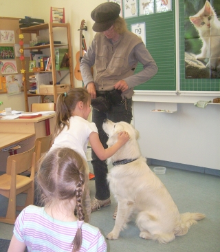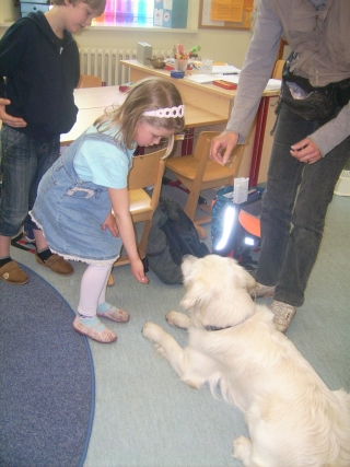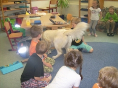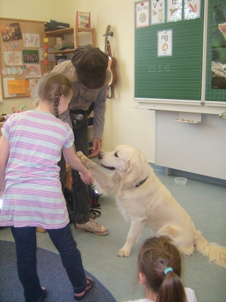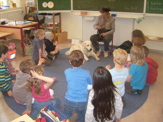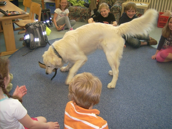 Zuert durften wir alleine in das Klassenzimmer, damit ich mir alles in Ruhe einmal anschauen konnte. Dann kamen die Kinder herein und setzten sich in einem großen Kreis um uns herum. So mag ich Kinder, nicht zu laut und nicht so eng auf mir drauf. Ich war so entspannt, dass ich mich erstmal gemütlich auf dem Rücken wälzte.