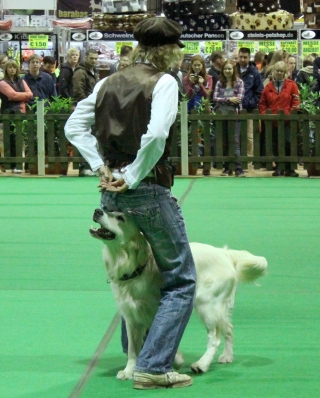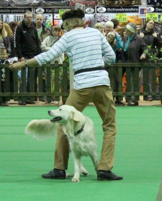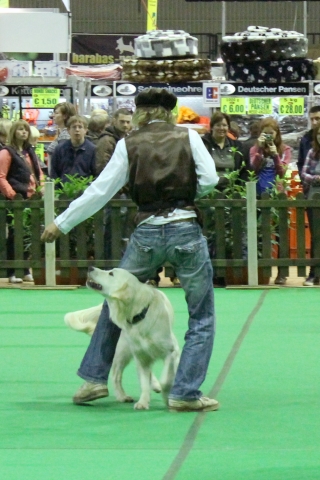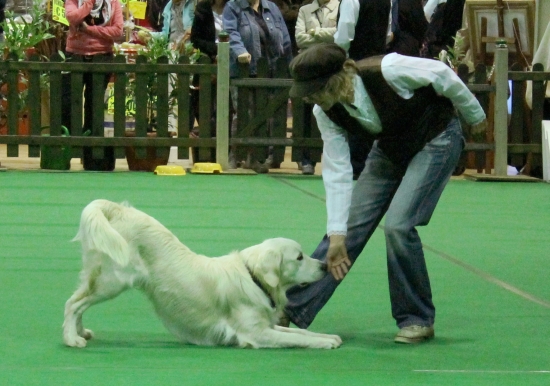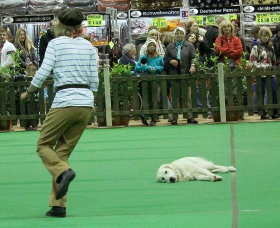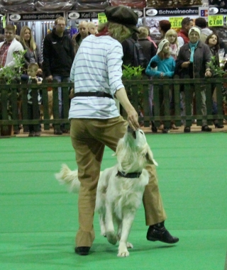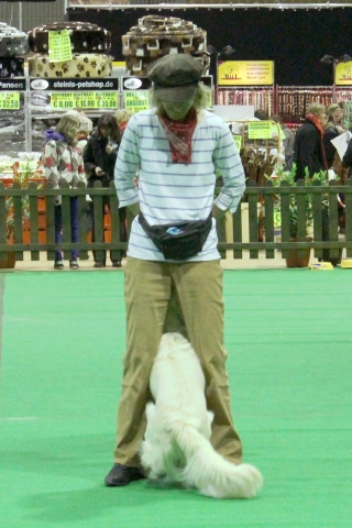 Erst hatten Ginny und ich eine kleine Vorführung ganz für uns allein. Die Chefin zeigte Dogdance mit einem und zwei Hunden und ich konnte zeigen, dass ich mit Bosse einen guten Lehrer gehabt habe: Ginny lief um mich herum, vorwärts und rückwärts unter mir durch und sprang über meinen Rücken und meine Pfote. Die Chefin war ganz gerührt, dass ich genauso ruhig und vorsichtig war, wie früher Bosse, ich habe mir auch besonders Mühe gegeben.