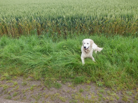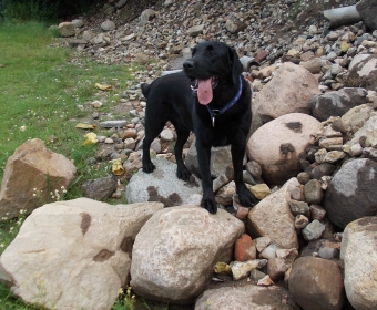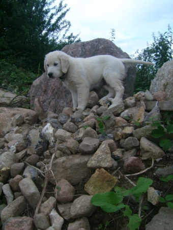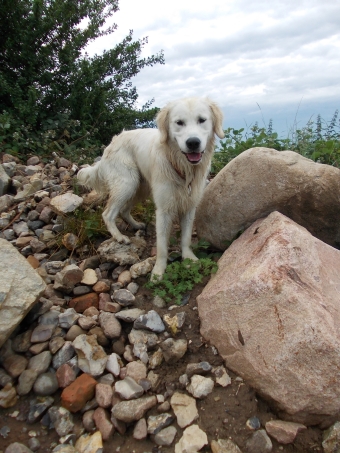 Erinnert ihr euch? Ginny war munter auf den Steinen herumgeturnt und ich in meiner Welpennaivität immer tapfer hinterher. Plötzlich war sie mit 2 großen Sätzen auf den Weg hinunter gesprungen und ich stand kläglich zwischen den Felsen und wusste nicht mehr vor und zurück.