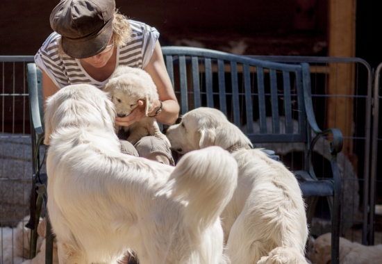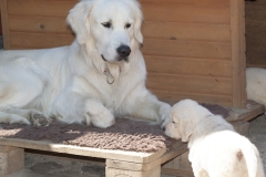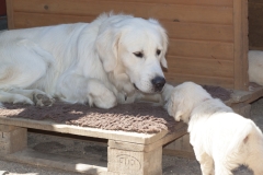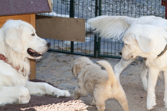 Maly ist wirklich eine Seele von Hund. Sie lässt sogar die Junghündinnen des Rudels mit in den Welpenauslauf springen. Sie ist anscheinend ganz zufrieden, wenn die jungen Damen Erziehungspflichten übernehmen, so ein ganzer Wurf ist ja auch anstrengend. Und Shari und Thalassa lernen nebenher, wie man Welpen aufzieht – eine tolle Sache!