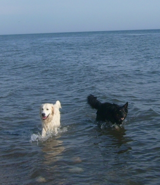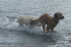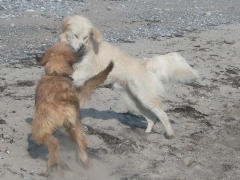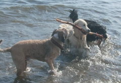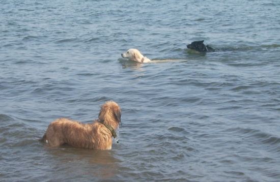 Anschließend wurde weiter getobt und gekämpft. Mit einem Stock gaben Jack und ich eine regelrechte Vorstellung. Die anderen waren ganz schön von unserem Geknurre beeindruckt und hielten gebührend Abstand. Merlin wollte eigentlich in Ruhe an seinem Schwimmstil arbeiten, aber der weiße Hai scheuchte ihn immer wieder aus demWasser.