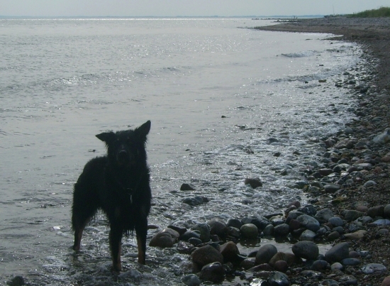 Die Chefin warf Steine weit hinaus ins Wasser, mieser Trick, aber Jack und ich waren so heiß aufs Schwimmen, dass wir ihr eine ganze Weile den Gefallen taten und eifrig hinterher schwammen. Schließlich hatte Jack keine Lust mehr und schimpfte sie bellenderweise aus, mensch darf doch seinen Hund nicht so verdummfideln ...